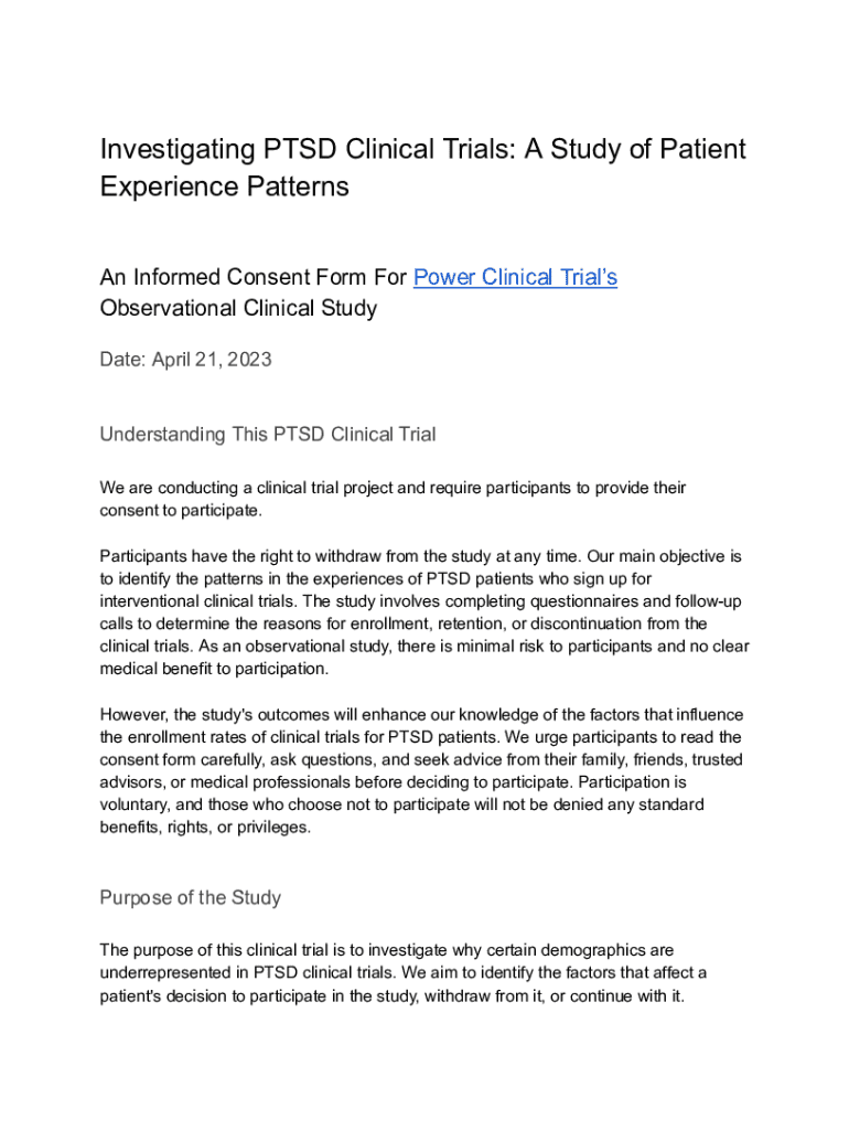 This document outlines the informed consent process for participants in a clinical trial aimed at understanding experiences of PTSD patients. It details the trial\'s purpose, the patient\'s rights,