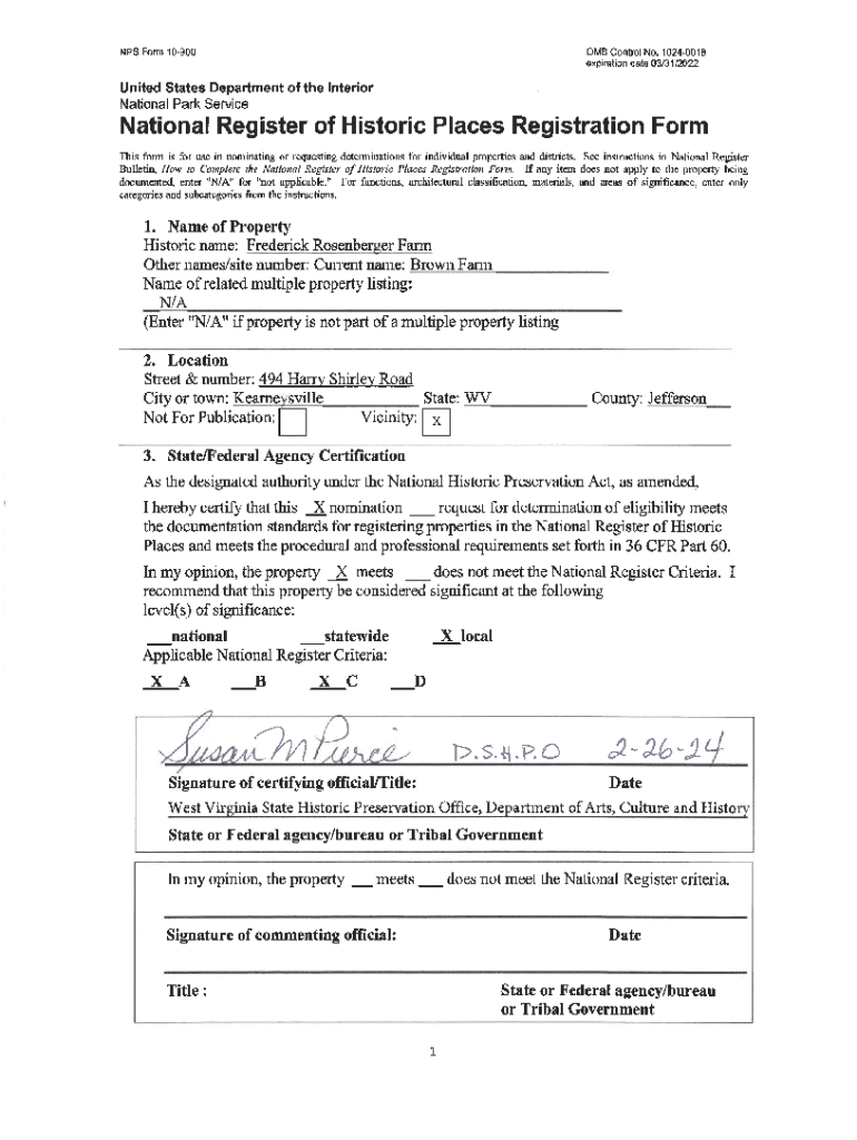 Official registration form for the Rosenberger-Brown Farm located in Jefferson County, West Virginia, detailing its historical significance and architectural features as part of the National Register