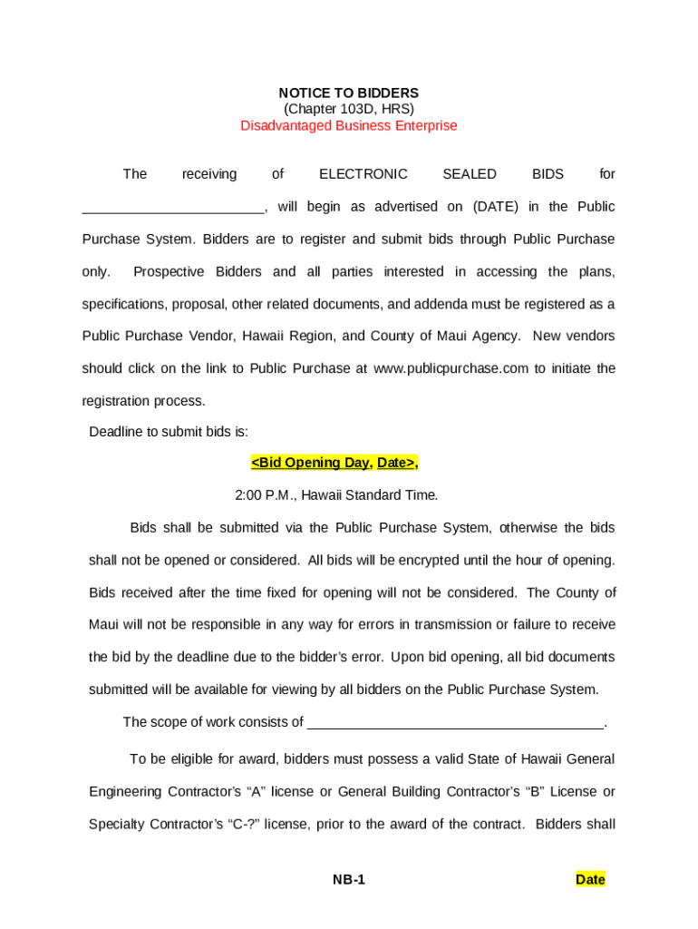 The Notice to Bidders is a document you can get filled-out and signed for specified reasons. Next, it is provided to the exact addressee to provide certain info and data. The completion and signing is available manually in hard copy or using a trusted service like PDFfiller. Such tools help to fill out any PDF or Word file without printing out. It also lets you customize it according to your needs and put a valid e-signature. Upon finishing, the user sends the Notice to Bidders to the recipient or several recipients by email and also fax. PDFfiller has got a feature and options that make your Word template printable. It provides different options for printing out. No matter, how you file a form after filling it out - in hard copy or electronically - it will always look neat and clear. In order not to create a new file from scratch every time, make the original form into a template. Later, you will have a rewritable sample.