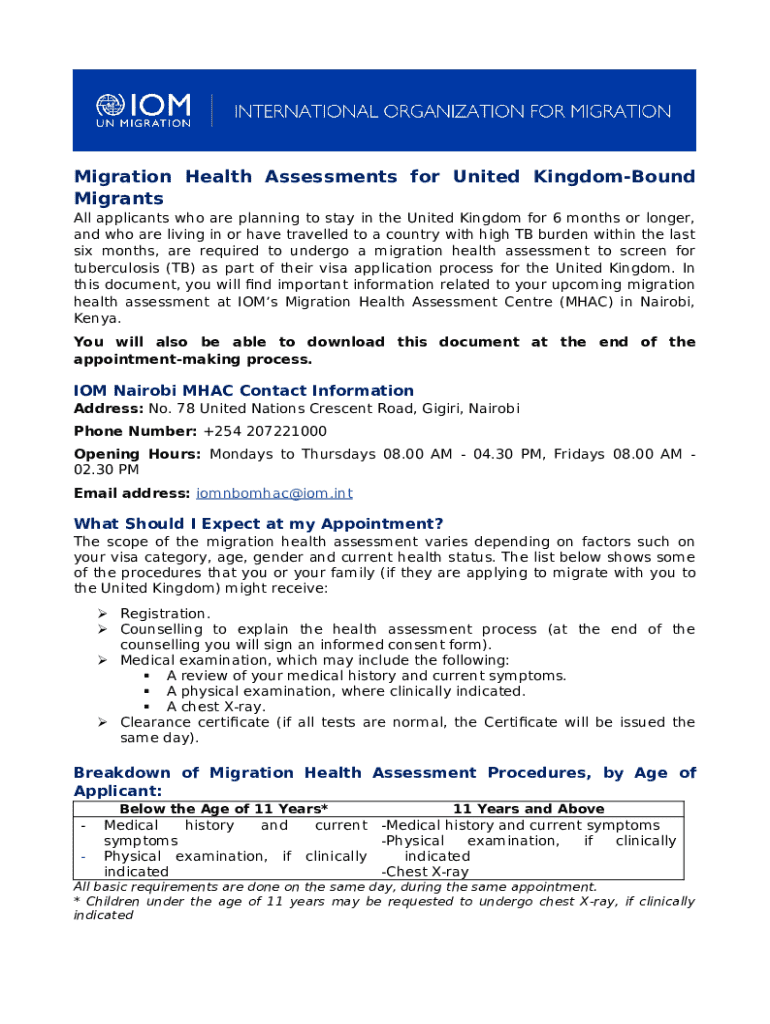 Instructions for the form All applicants who are planning to stay in the United Kingdom for 6 months or longer, and who are living in or have travelled to a country with high TB burden within the last six months, are required to undergo a migration health assessment to screen - kenya iom
