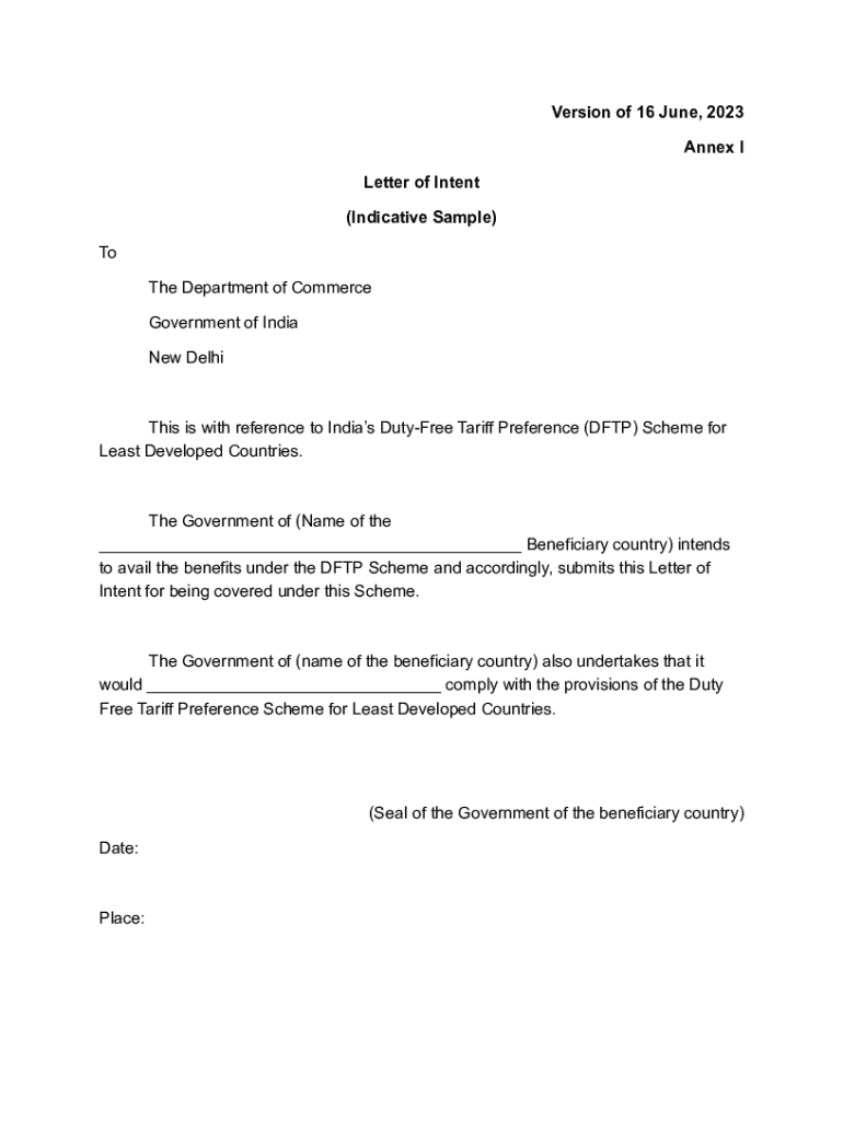This document serves as a Letter of Intent for the Government of a beneficiary country to apply for the benefits under India\'s Duty-Free Tariff Preference (DFTP) Scheme for Least Developed Countries,