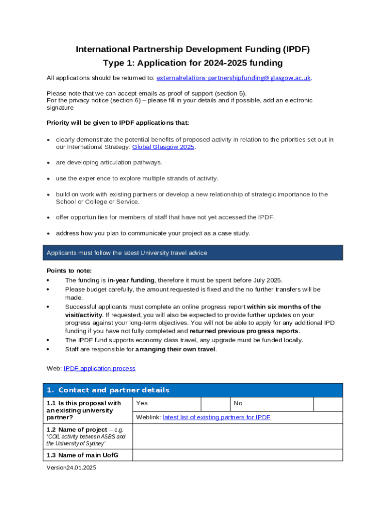 The International Partnership Development Funding Application is a Word document that should be submitted to the required address in order to provide certain information. It needs to be completed and signed, which can be done manually, or using a certain software like PDFfiller. This tool lets you complete any PDF or Word document directly from your browser (no software requred), customize it depending on your purposes and put a legally-binding e-signature. Once after completion, the user can send the International Partnership Development Funding Application to the relevant person, or multiple recipients via email or fax. The editable template is printable too because of PDFfiller feature and options offered for printing out adjustment. In both electronic and physical appearance, your form will have a organized and professional appearance. You can also save it as the template for later, there's no need to create a new file over and over. You need just to customize the ready form.