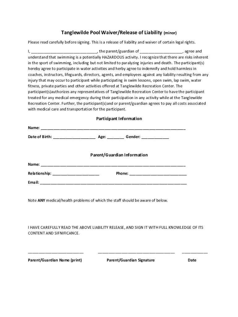 The Tanglewilde pool waiver/release is a legal document that participants in pool activities must sign to acknowledge the risks associated with swimming and to waive any liability claims against the property owners or organizers.