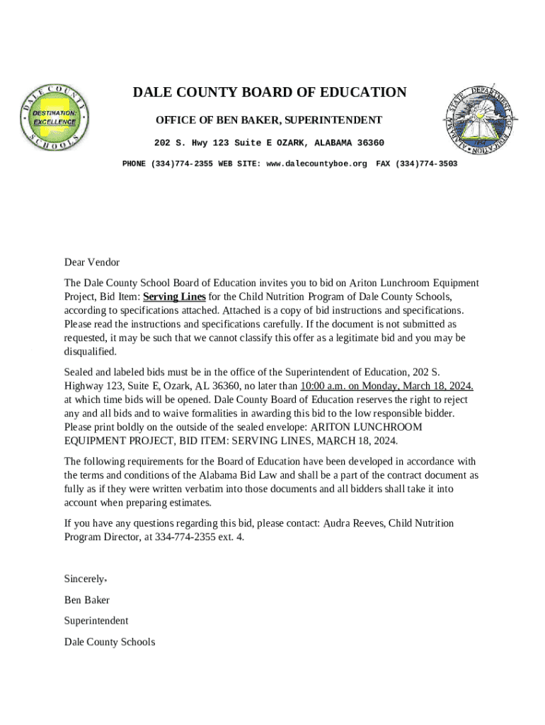 Instructions for the form Ariton Lunchroom Equipment Project Bid Document