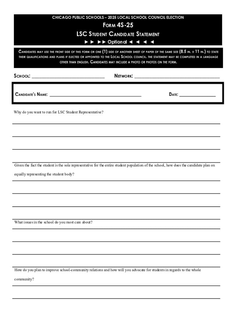 Este formulario permite a los estudiantes candidatos para el Consejo Local de Escuelas presentar su declaración de candidatura, abordando temas como su motivación para postularse, cómo planean