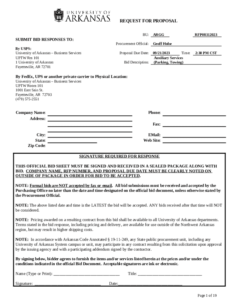 The NOTE: al bids are NOT accepted by fax or email is a fillable form in MS Word extension which can be completed and signed for specific purposes. In that case, it is provided to the actual addressee to provide some info of certain kinds. The completion and signing is possible manually or with a trusted application e. g. PDFfiller. These services help to send in any PDF or Word file online. While doing that, you can customize its appearance depending on your requirements and put an official legal e-signature. Once you're good, the user ought to send the NOTE: al bids are NOT accepted by fax or email to the respective recipient or several of them by email and also fax. PDFfiller has a feature and options that make your blank printable. It has different settings for printing out appearance. It does no matter how you'll distribute a form - in hard copy or by email - it will always look professional and clear. In order not to create a new writable document from scratch over and over, make the original Word file into a template. After that, you will have an editable sample.