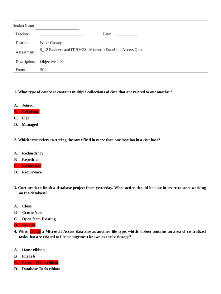 Frequently asked questions about the form 912 Business and IT BM20 - Microsoft Excel and Access Quiz 1