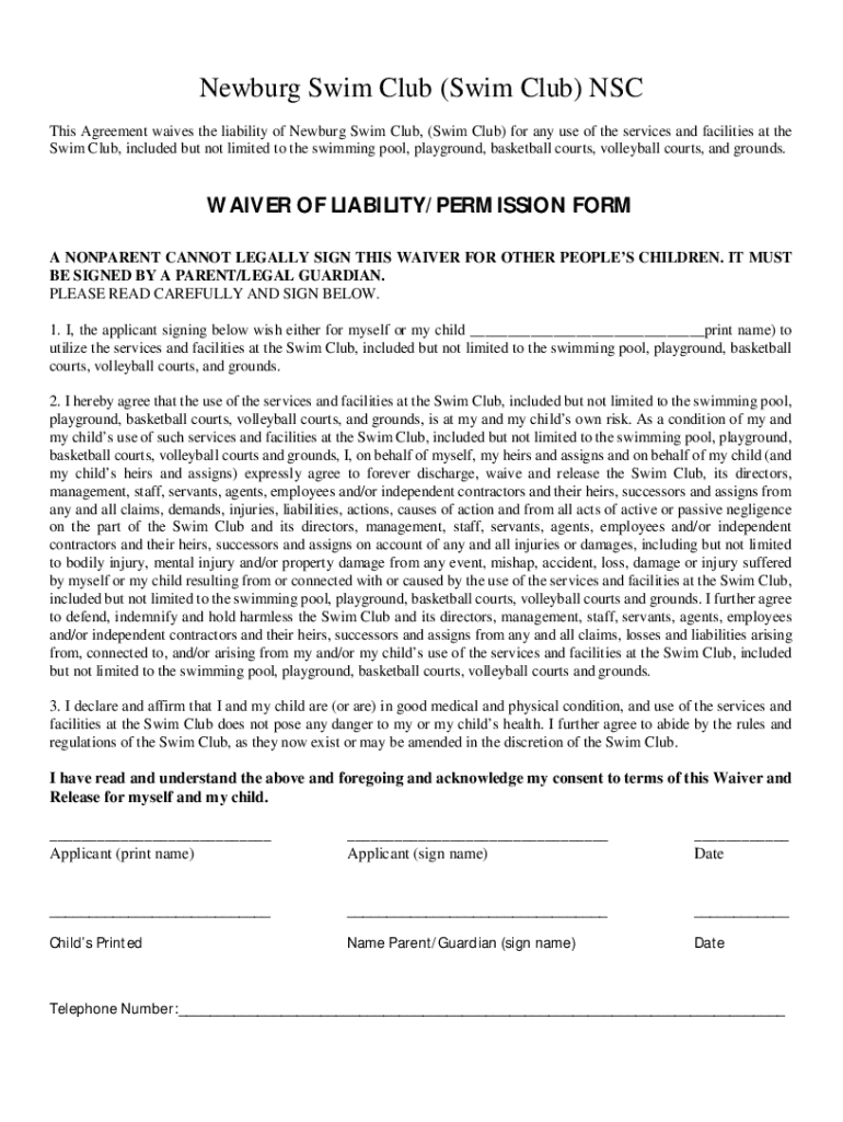 The Newburg Swim Club waiver is a legal document that members and participants must sign to acknowledge the risks associated with swimming and to release the club from liability in case of injuries.
