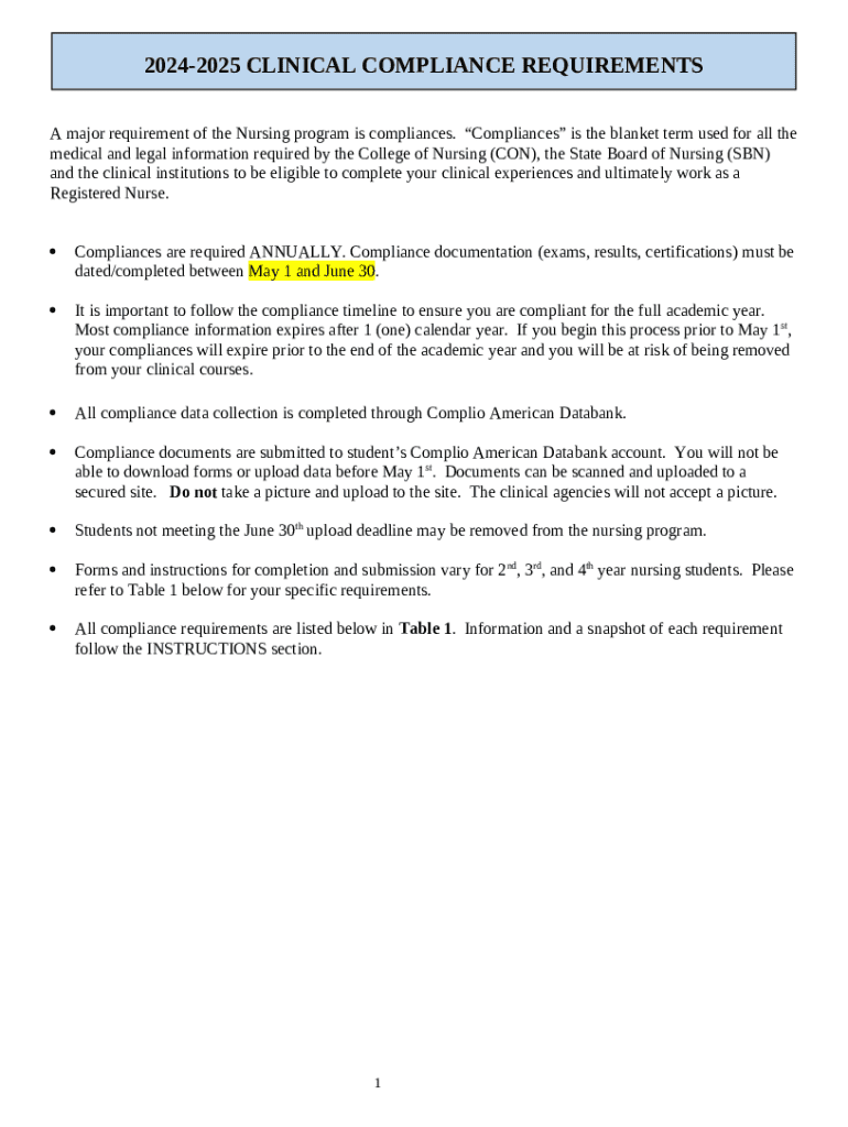 Template "Compliances" is the blanket term used for all the medical and legal ination required by the College of Nursing (CON), the State Board of Nursing (SBN) and the clinical institutions to be eligible to complete your clinical experiences a instructions