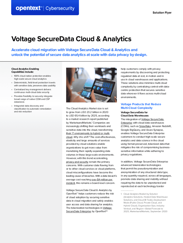 Accelerate cloud migration with Voltage SecureData Cloud & Analytics and unlock the potential of secure data analytics at scale with data privacy by design. This solution helps customers comply with