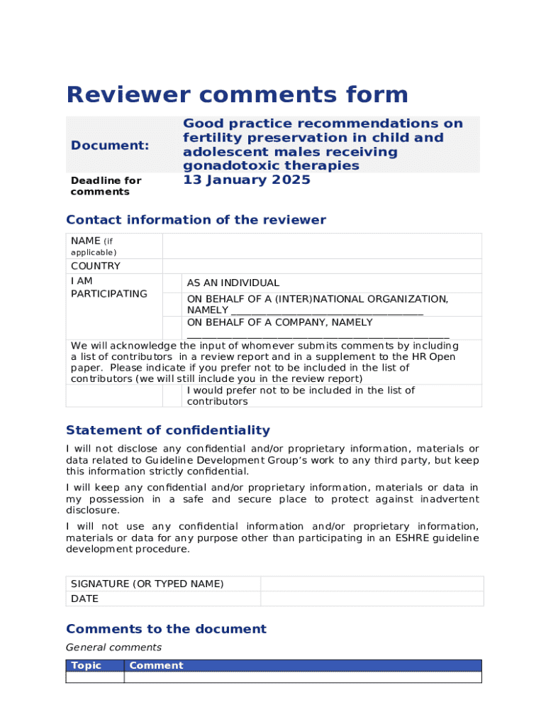 The Reviewer Comments is a writable document required to be submitted to the relevant address to provide certain info. It has to be filled-out and signed, which is possible manually in hard copy, or by using a particular software such as PDFfiller. This tool helps to fill out any PDF or Word document directly in your browser, customize it depending on your needs and put a legally-binding electronic signature. Once after completion, the user can send the Reviewer Comments to the relevant individual, or multiple ones via email or fax. The template is printable too from PDFfiller feature and options offered for printing out adjustment. In both digital and in hard copy, your form will have a clean and professional look. Also you can save it as the template for later, so you don't need to create a new blank form from the beginning. All that needed is to amend the ready form.