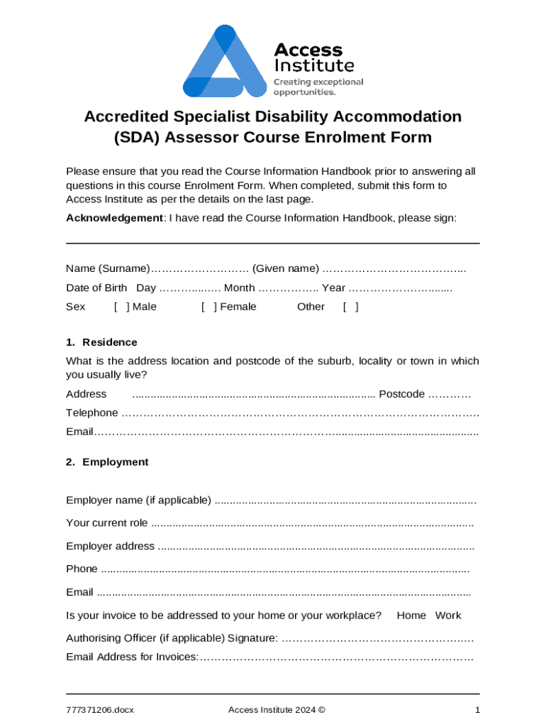 Accredited Specialist Disability Accommodation (sda) Assessor Course Enrolment template instructions