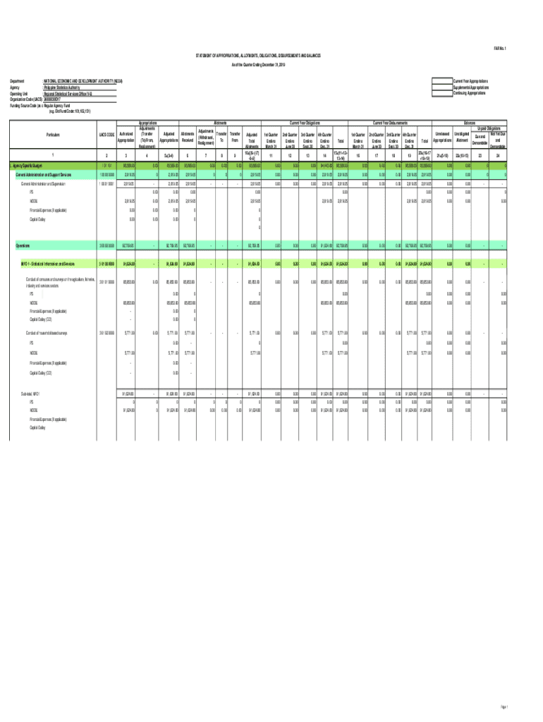 This document details the appropriations, allotments, obligations, disbursements, and balances of the National Economic and Development Authority (NEDA) for the Philippine Statistics Authority as