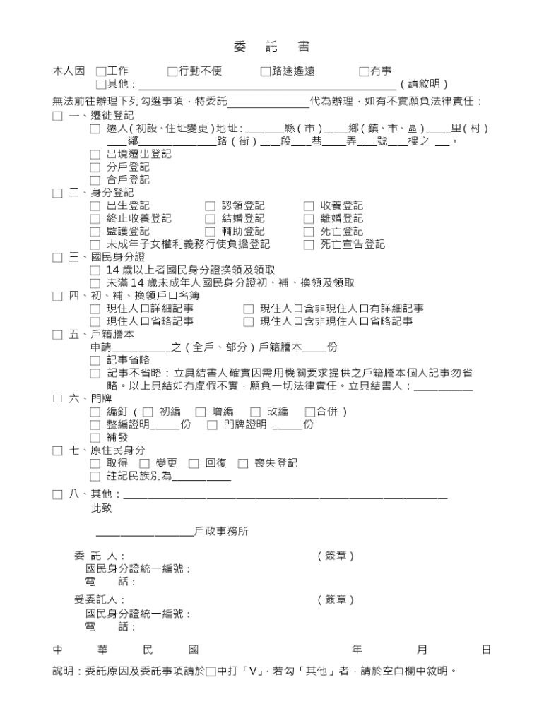 本文件用於委託他人代辦相關的行政事務。使用者可以因為工作、行動不便或其他原因,授權他人辦理遷徙登記、身分登記及其他法律事務。此文件要求填寫受委託人的詳細資料及委託原因。