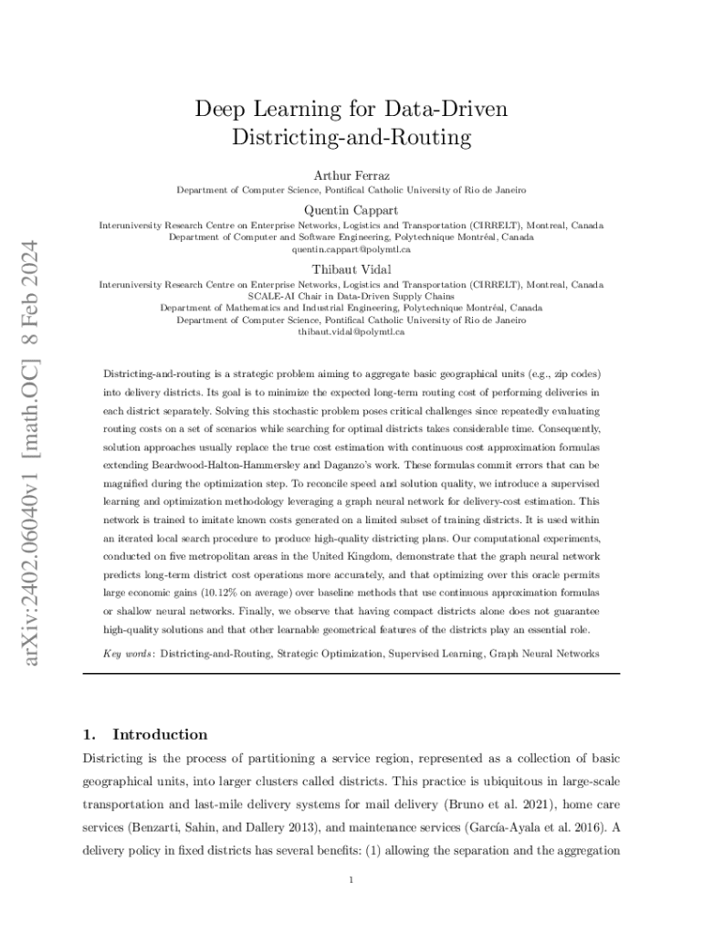 Deep Learning for DataDriven DistrictingandRouting Arthur Ferraz Department of Computer Science, Pontifical Catholic University of Rio de JaneiroQuentin CappartarXiv:2402.06040v1 [math.OC] 8 Feb 2024Interuniversity