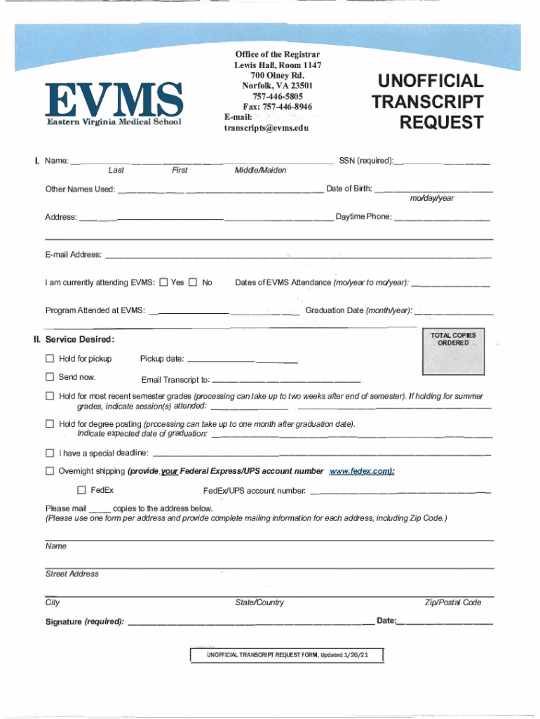 This form is used to request an unofficial transcript from the Eastern Virginia Medical School (EVMS). It requires personal information, dates of attendance, program details, and service preferences.