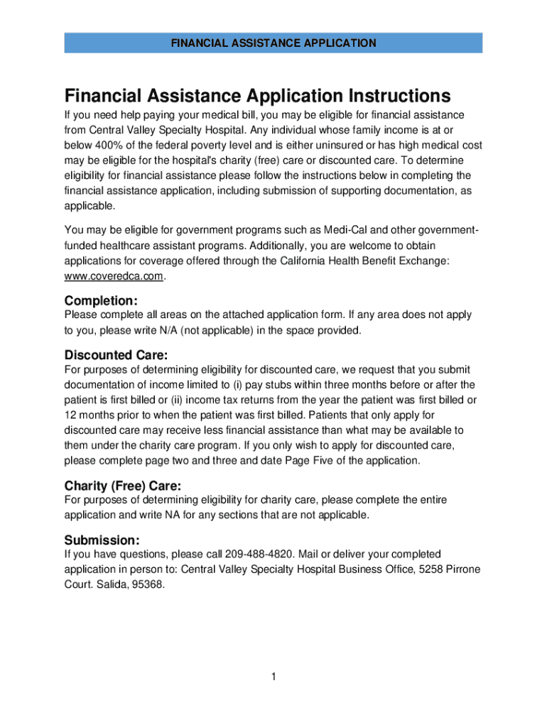 Aplicación para asistencia financiera de Central Valley Specialty Hospital para ayudar a las personas a pagar sus facturas médicas en caso de cumplir con los requisitos de elegibilidad, incluyendo