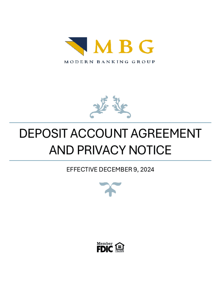 This document outlines the terms and conditions governing your deposit accounts with Modern Bank, including account basics, applying for and closing accounts, interest rates, funds availability, and