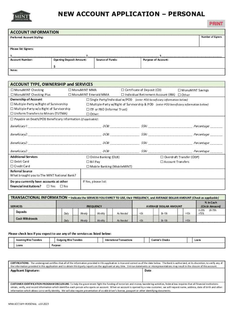 This document serves as an application form for opening a personal bank account, allowing individuals to provide necessary account information, signers, account types, ownership details, and services