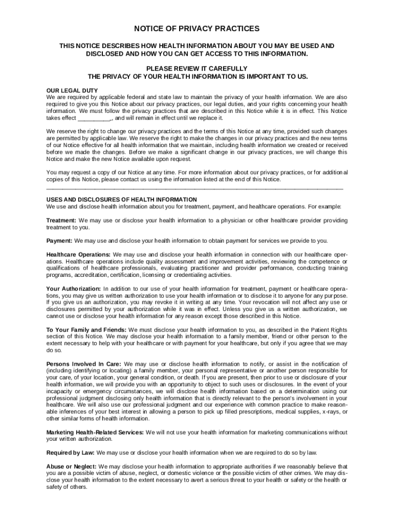 The Notice of Privacy Practices is a document that has to be completed and signed for certain purposes. In that case, it is provided to the exact addressee to provide specific details and data. The completion and signing may be done or using a trusted solution like PDFfiller. Such applications help to submit any PDF or Word file online. While doing that, you can edit it depending on the needs you have and put an official legal digital signature. Once finished, the user sends the Notice of Privacy Practices to the recipient or several recipients by email or fax. PDFfiller provides a feature and options that make your document of MS Word extension printable. It offers different options when printing out appearance. It doesn't matter how you'll send a form after filling it out - physically or by email - it will always look professional and organized. In order not to create a new editable template from the beginning every time, turn the original form as a template. Later, you will have an editable sample.
