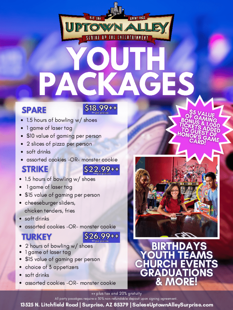 This document provides various party package options at Uptown Alley, including details on bowling, laser tag, gaming, and food options along with pricing and reservation requirements.