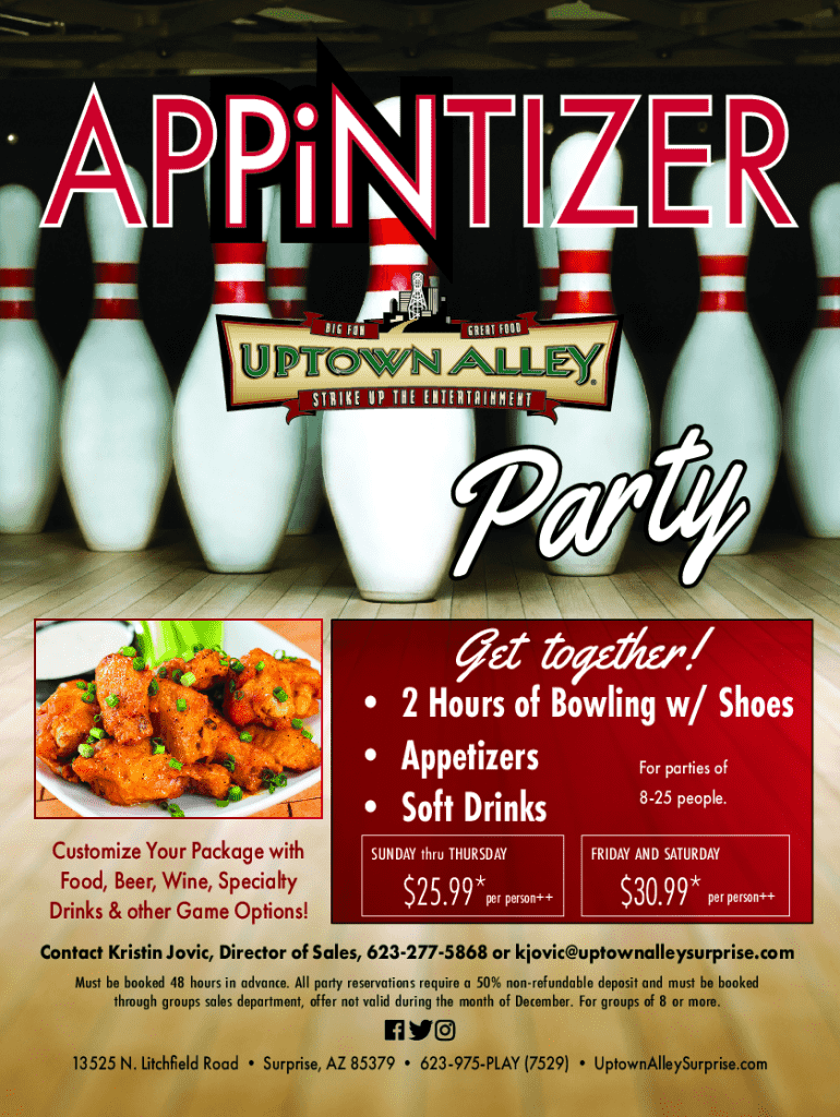 Form to request a party package at Uptown Alley, including options for bowling, appetizers, drinks, and enhancements for groups of 8-25 people.