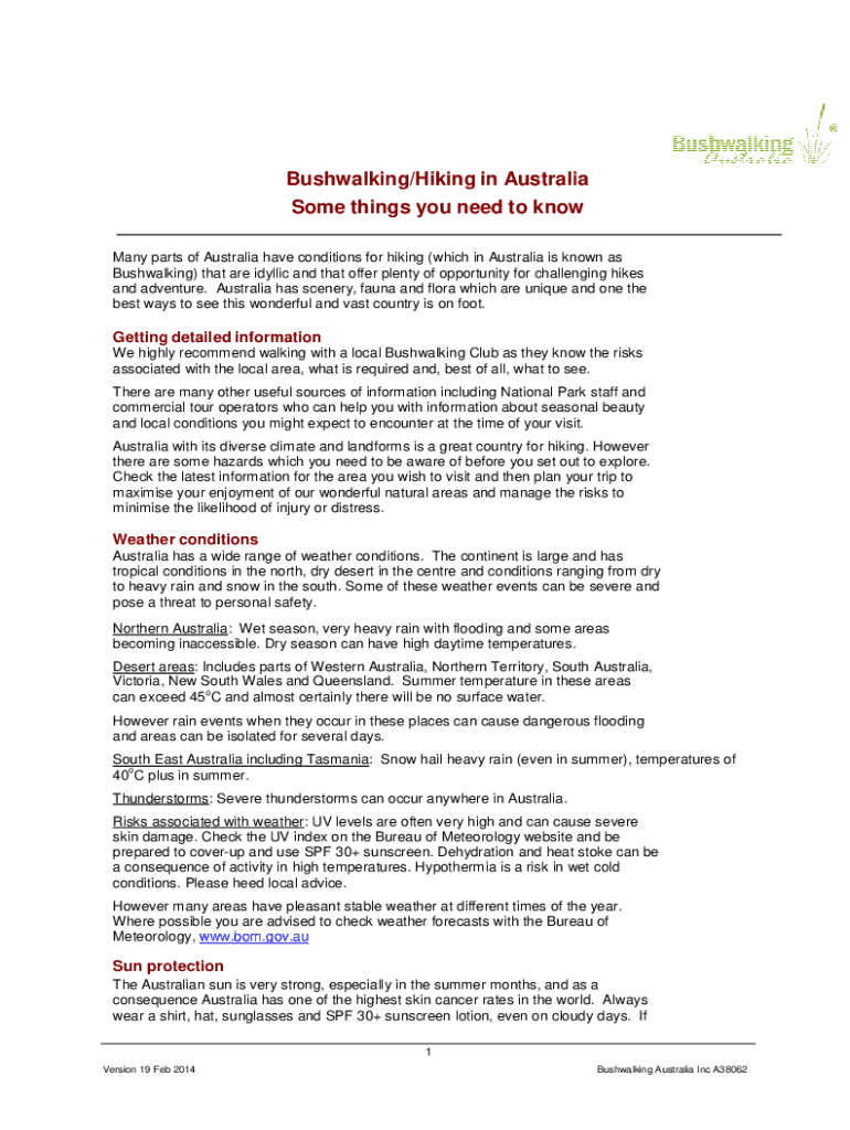 Bushwalking/Hiking in Australia Some things you need to know Many parts of Australia have conditions for hiking (which in Australia is known as Bushwalking) that are idyllic and that offer plenty