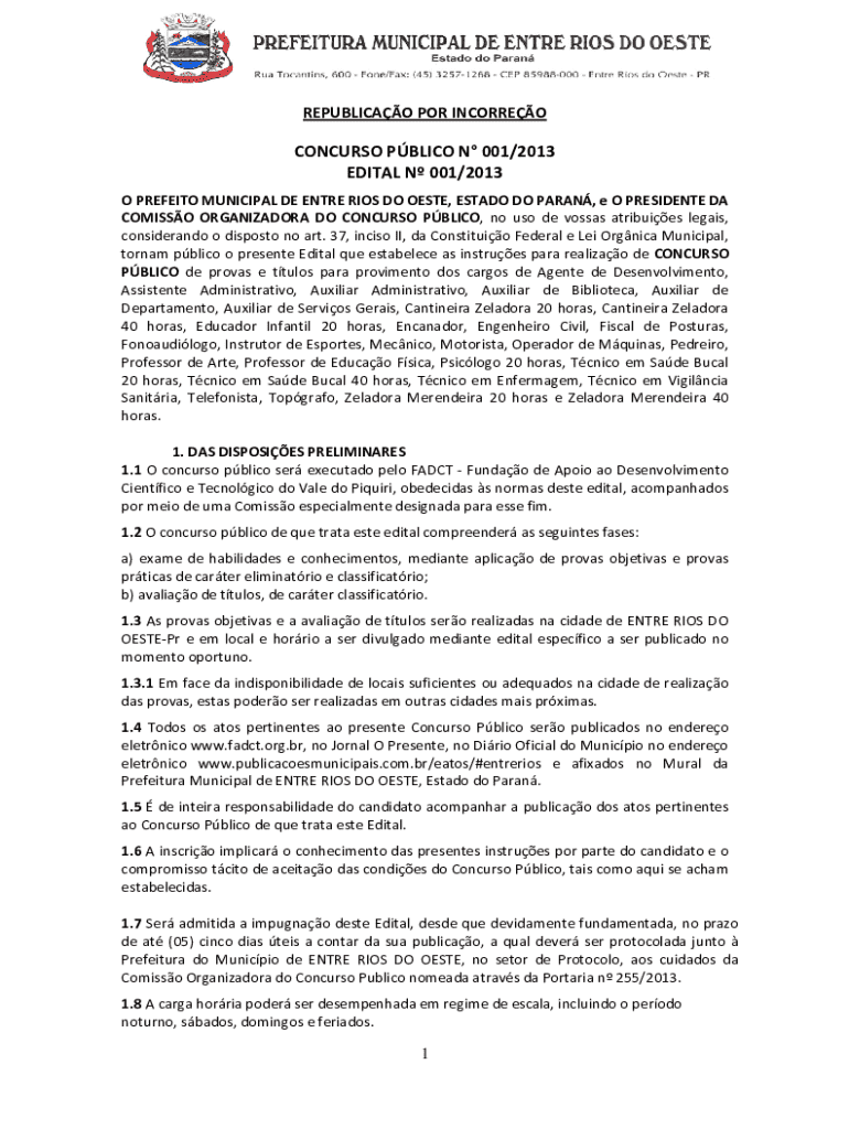REPUBLICAO POR INCORREOCONCURSO PBLICO N 001/2013 EDITAL N 001/2013 O PREFEITO MUNICIPAL DE ENTRE RIOS DO OESTE, ESTADO DO PARAN, e O PRESIDENTE DA COMISSO ORGANIZADORA DO CONCURSO PBLICO, no uso