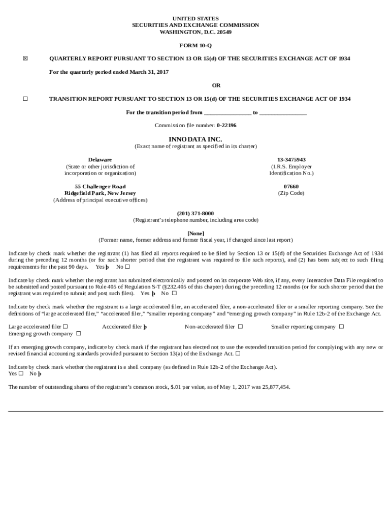 Este informe trimestral proporciona una visión de la situación financiera, los resultados de operaciones y los flujos de efectivo de Innodata Inc. para el periodo finalizado el 31 de marzo de 2017.