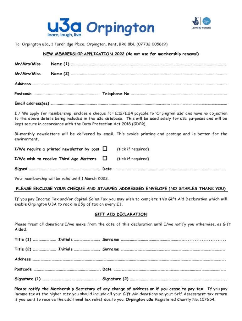 An application form for new members to join Orpington U3A, including details on how to apply, membership fees, and options for receiving newsletters.
