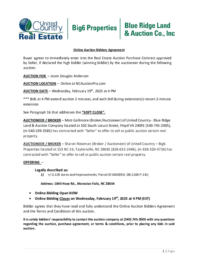 Este acuerdo establece los términos para los compradores que participan en una subasta de bienes raíces en línea, incluyendo la aceptación de contratos de compra y detalles sobre el proceso de