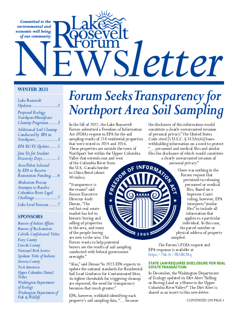 WINTER 2023 Lake Roosevelt Updates.....................2 Proposed Ecology NorthportWaterfront Cleanup Progresses........3 Additional Soil Cleanup Conducted by EPA in Northport..................3 EPA