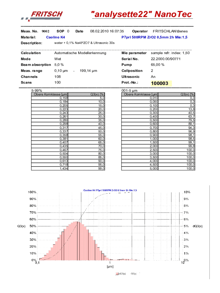 Das Dokument beschreibt die Analyse von Kaolin K4 mit verschiedenen Parametern und Ergebnissen zur Partikelgrößenverteilung.