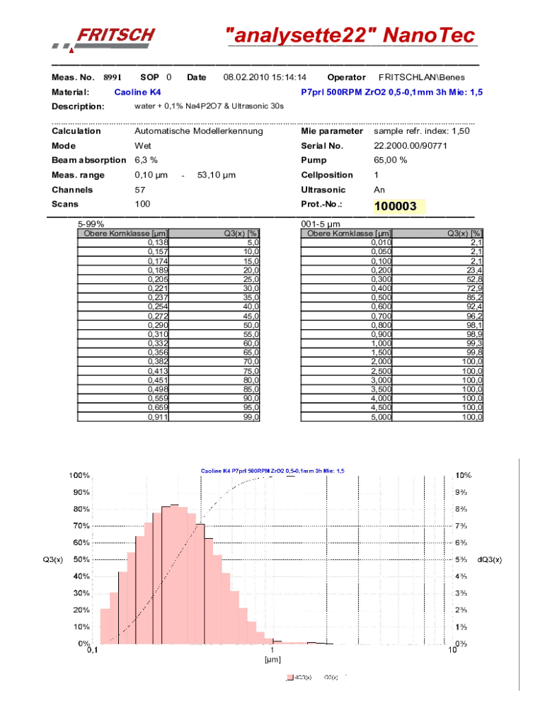 This document provides detailed measurement data and parameters for a NanoTec analysis using the analysette22 device. It includes information such as operator details, material specifications, measurement