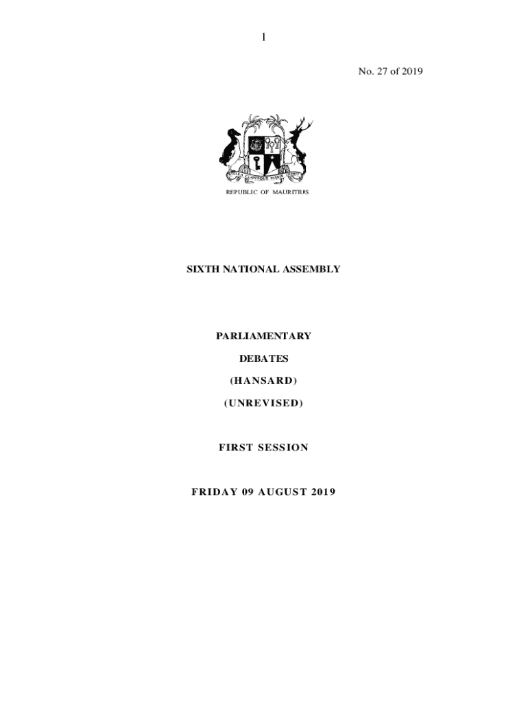 1 No. 27 of 2019SIXTH NATIONAL ASSEMBLYPARLIAMENTARY DEBATES (HANSARD) (UNREVISED)FIRST SESSIONFRIDAY 09 AUGUST 20192CONTENTS PAPERS LAID MOTION BILLS (Public) ADJOURNMENT3 THE CABINET(Formed by Hon.