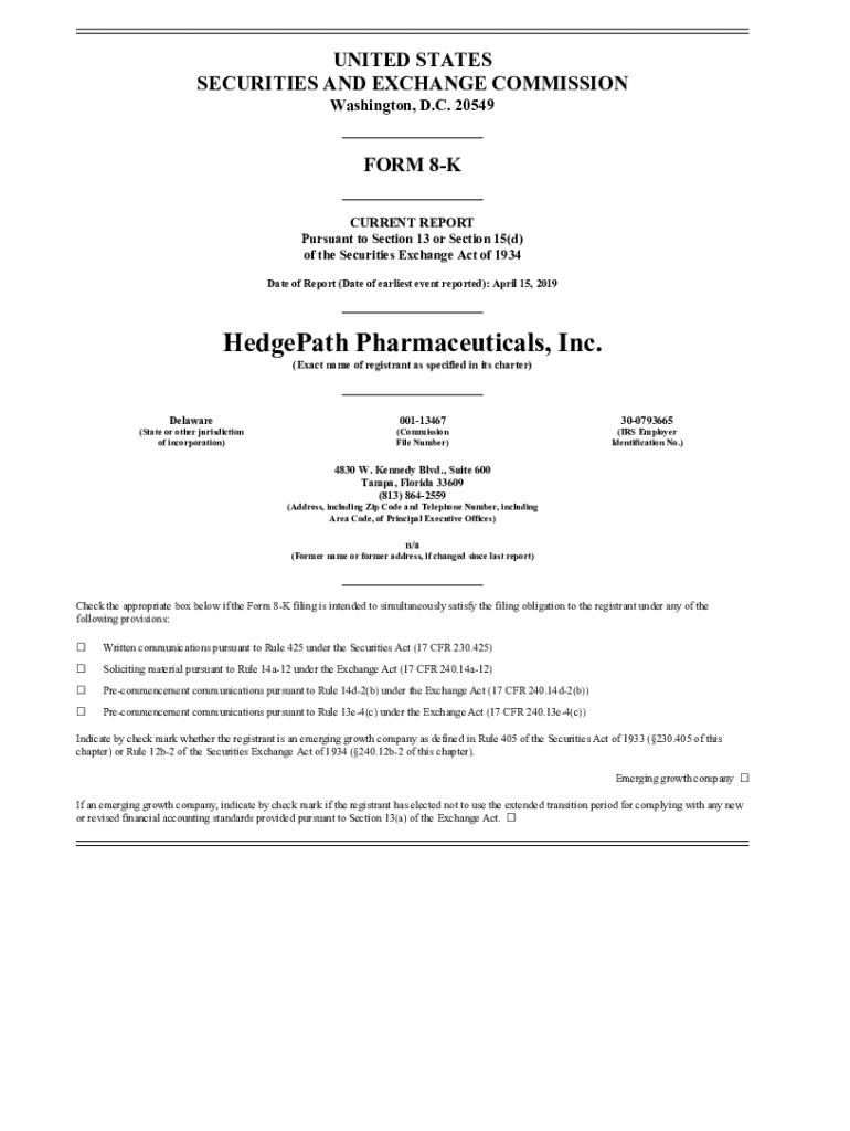 This document is a Current Report filed with the SEC by HedgePath Pharmaceuticals, Inc. on April 15, 2019, announcing the election of W. Mark Watson as Chairman of the Board and details surrounding