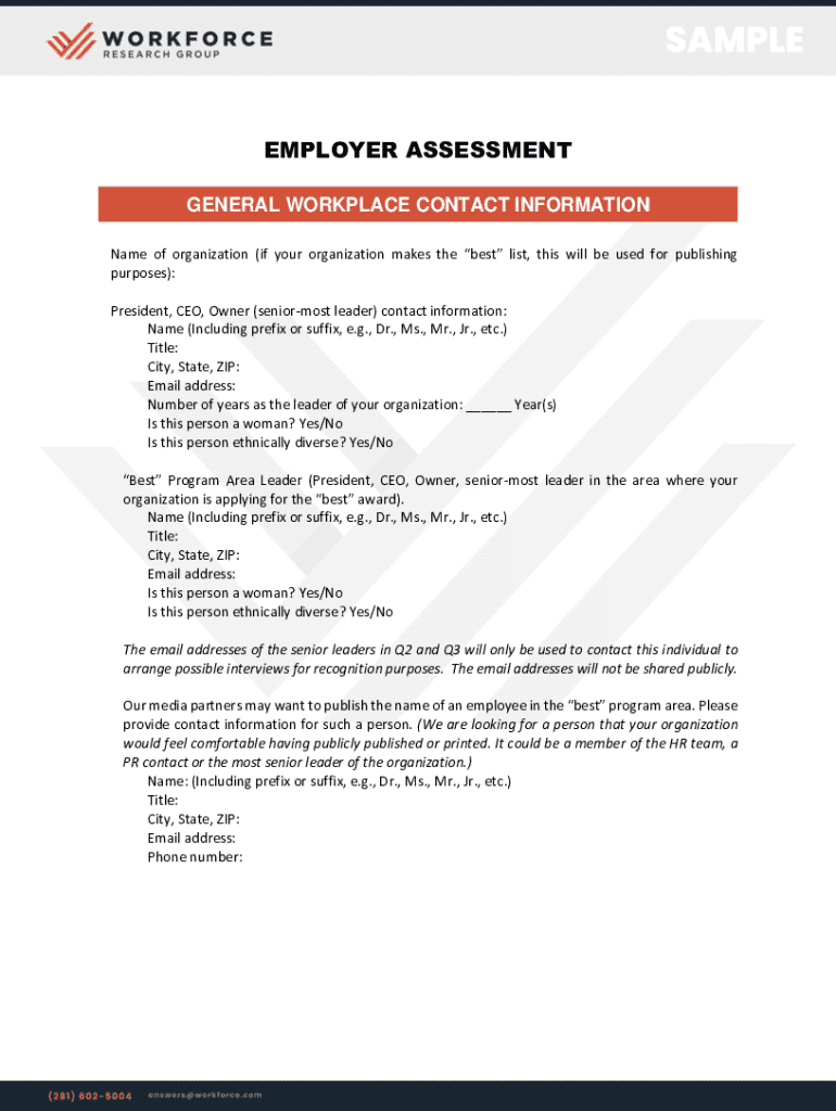 This document is designed to collect essential information from organizations applying for the \'best\' workplace award. It includes sections on workplace contact information, general information