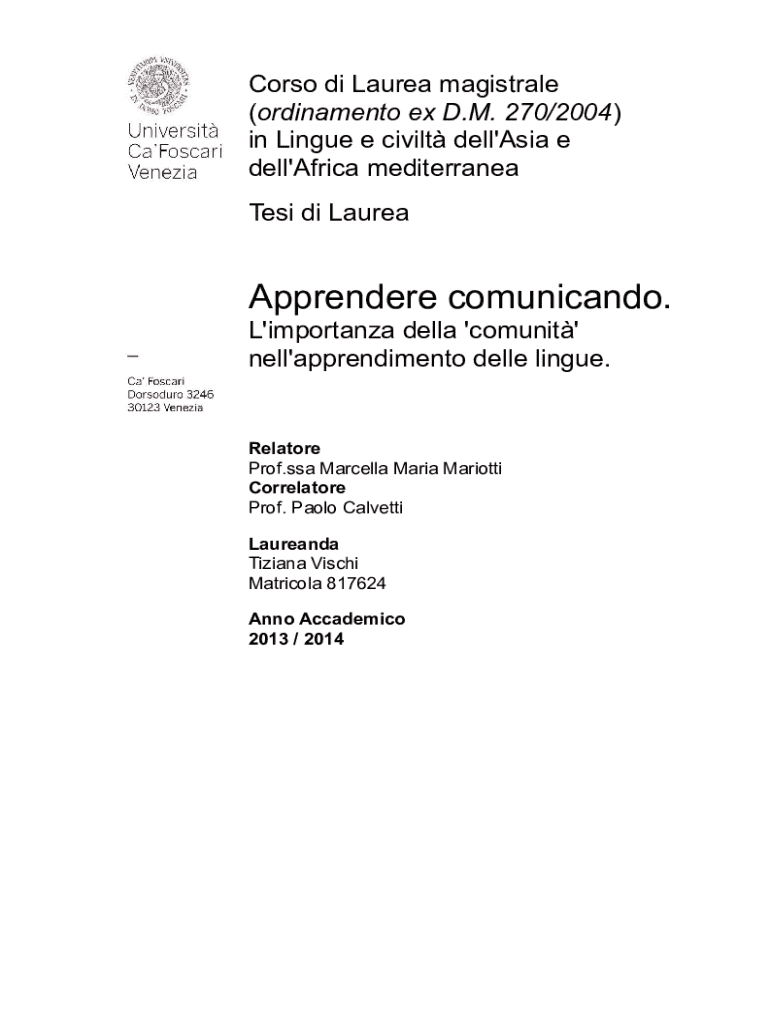 Corso di Laurea magistrale (ordinamento ex D.M. 270/2004) in Lingue e civilt dell\'Asia e dell\'Africa mediterranea Tesi di LaureaApprendere comunicando. L\'importanza della \'comunit\' nell\'apprendimento