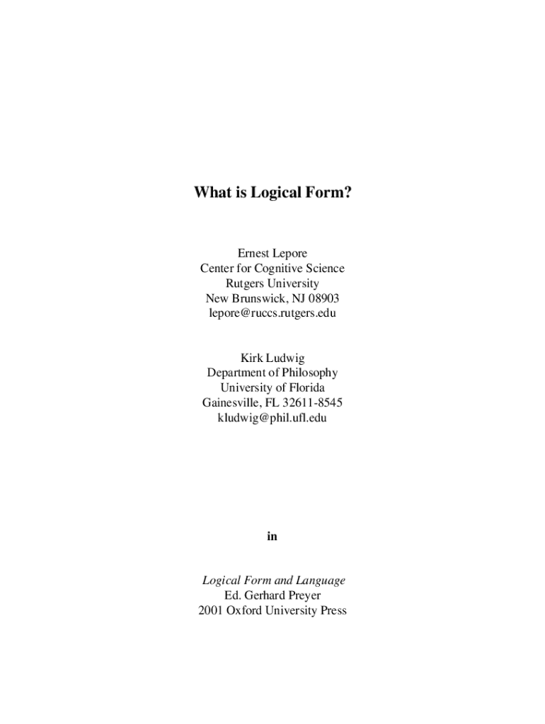 What is Logical Form?Ernest Lepore Center for Cognitive Science Rutgers University New Brunswick, NJ 08903 lepore@ruccs.rutgers.eduKirk Ludwig Department of Philosophy University of Florida Gainesville,