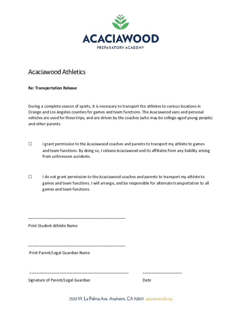 This form is used to grant or deny permission for Acaciawood coaches and parents to transport student-athletes to games and team functions during the sports season. It includes a liability release