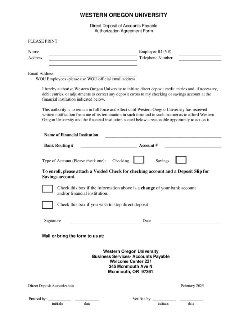 Este formulario autoriza a la Universidad de Western Oregon a iniciar depósitos directos en su cuenta bancaria. Incluye información sobre cómo cambiar o detener los depósitos directos y los detalles