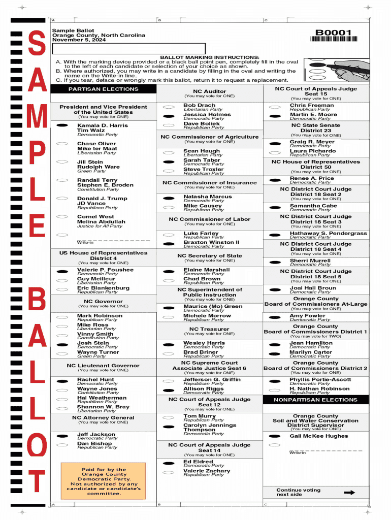 +++ 1r:,JIp.B7CB0001 11111111111 1111 1111 1111111111111Sample Ballot Orange County, North Carolina November 5, 2024BALLOT MARKING INSTRUCTIONS:A. With the marking device provided or a black ball