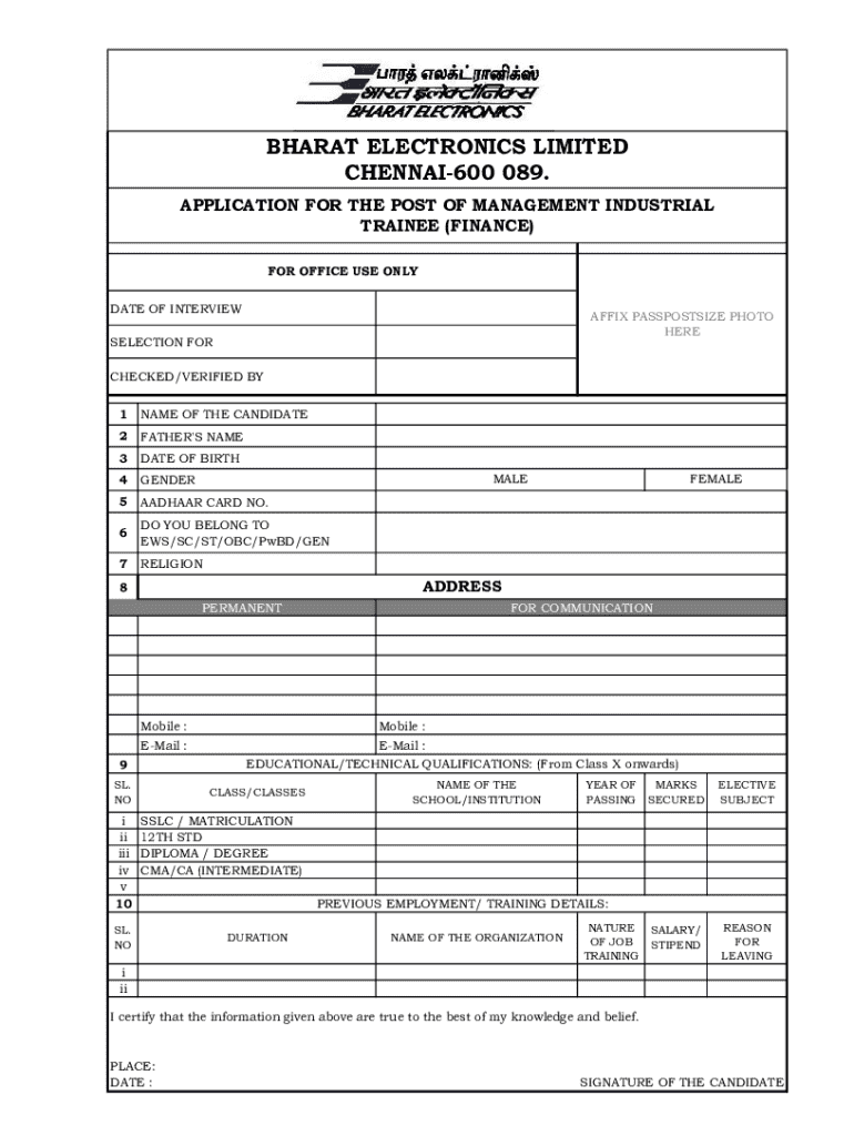 This document is an application form for candidates applying for the position of Management Industrial Trainee in Finance at Bharat Electronics Limited, Chennai. It collects personal, educational,