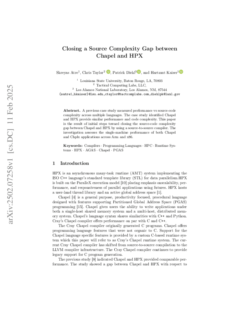 Closing a Source Complexity Gap between Chapel and HPX Shreyas Atre1 , Chris Taylor2, Patrick Diehl3, and Hartmut Kaiser1Louisiana State University, Baton Rouge, LA, 70803 2 Tactical Computing Labs,