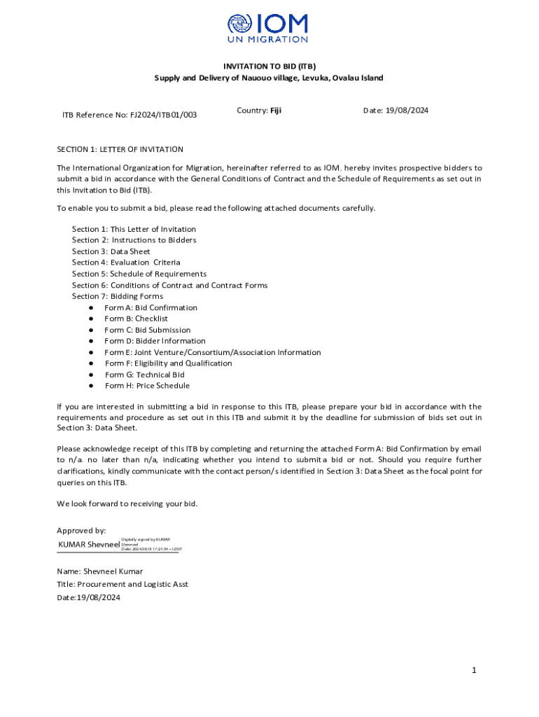 The International Organization for Migration invites prospective bidders to submit bids for the construction of a Multipurpose Evacuation Centre at Nauouo village. The ITB includes instructions on
