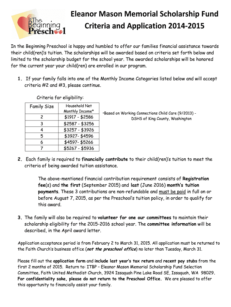 Get the free Eleanor Mason Memorial Scholarship Fund Criteria... - inthebeginningpreschool