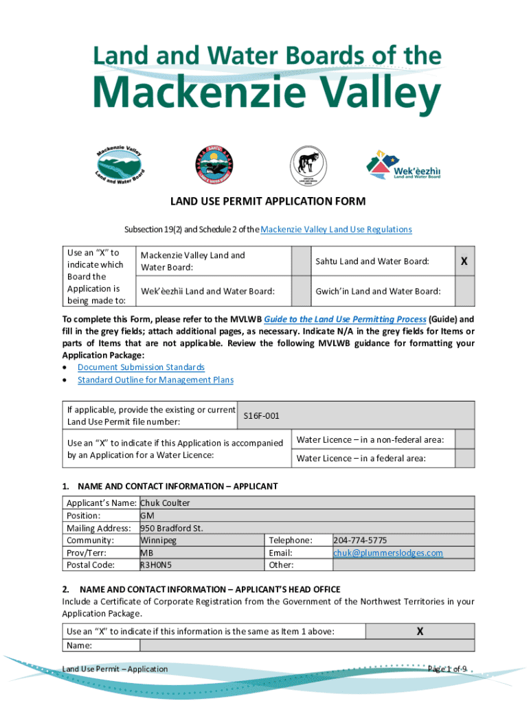 This form is used to apply for a Land Use Permit in compliance with section 19(2) and Schedule 2 of the Mackenzie Valley Land Use Regulations. It requires details about the applicant, location of
