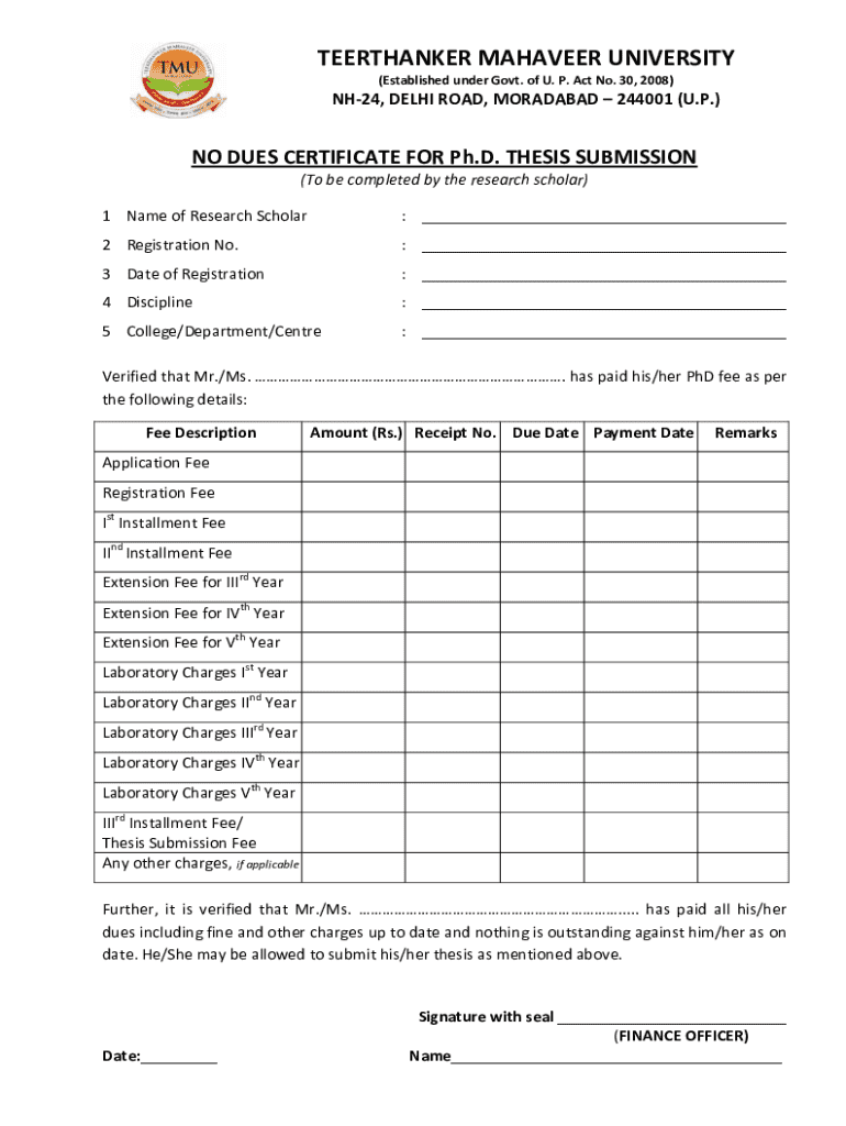 Get the free No Dues Certificate for Ph.d. Thesis Submission