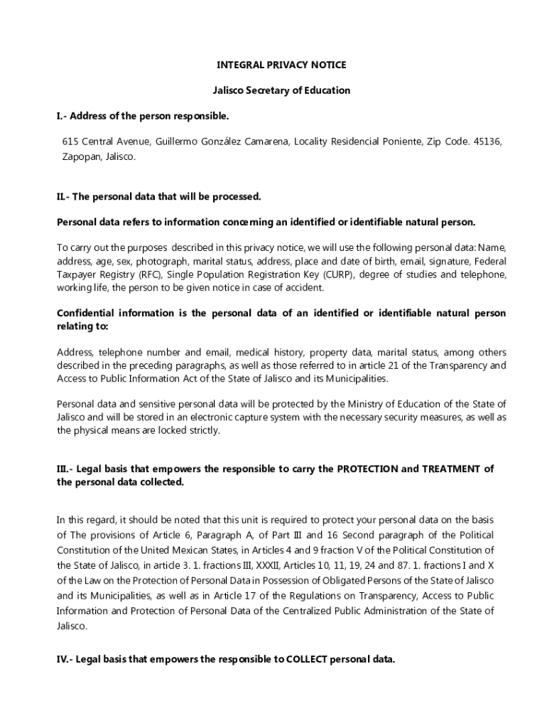 Este aviso de privacidad describe cómo la Secretaría de Educación del Estado de Jalisco manejará y protegerá los datos personales de los individuos, en conformidad con la legislación vigente.