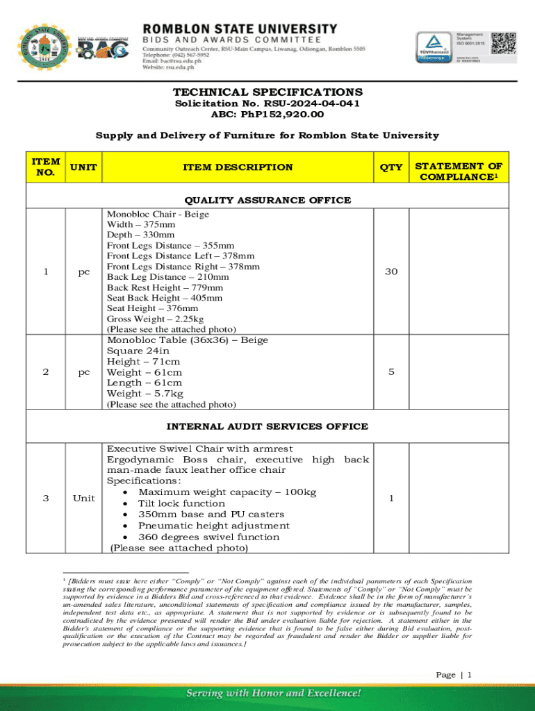 TECHNICAL SPECIFICATIONS Solicitation No. RSU202404041 ABC: PhP152,920.00 Supply and Delivery of Furniture for Romblon State University ITEM UNIT NO.ITEM DESCRIPTIONQTYSTATEMENT OF COMPLIANCE1QUALITY